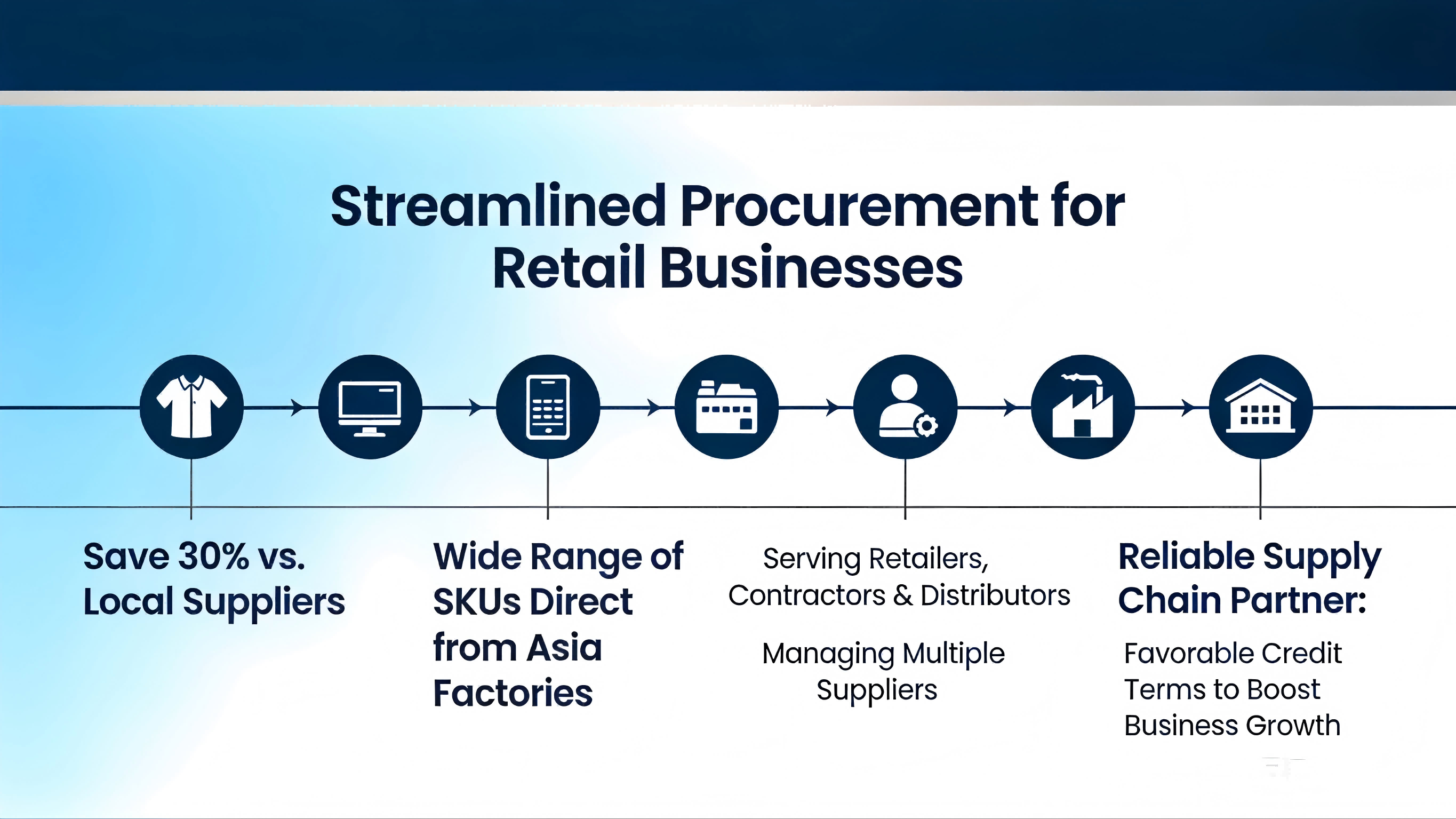 Save 30% vs. local suppliers We source a wide range of SKUs directly from Asia factories for retailers,contractors and distributors. As your reliable supply chain partner, we manage multiple suppliers on your behalf and provide favorable credit terms to boost your business growth