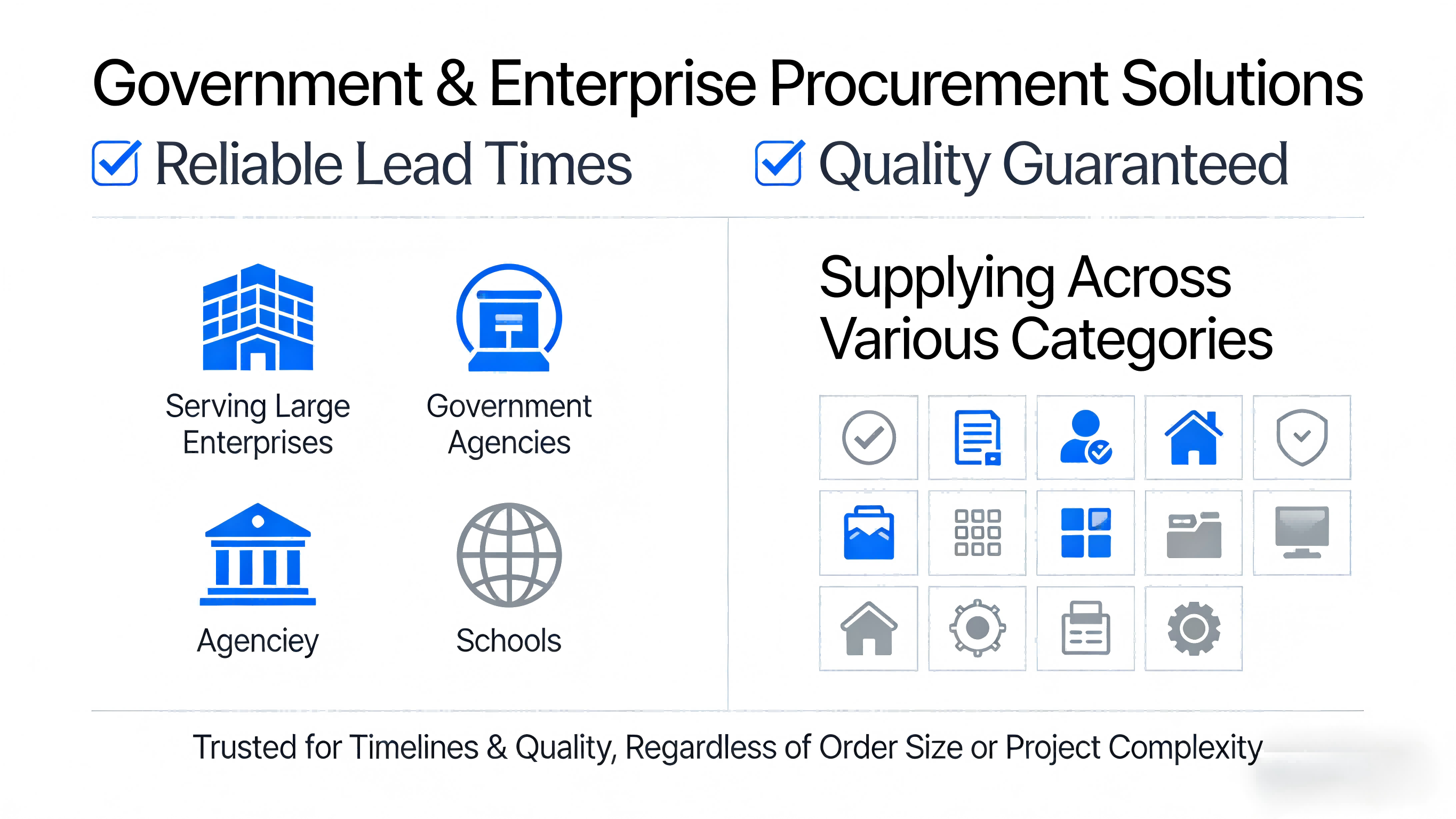 We are supplying products to large enterprises, government agencies, and schools across various categories. Our clients trust us for reliable timelines and strict quality control, regardless of order size or project complexity.