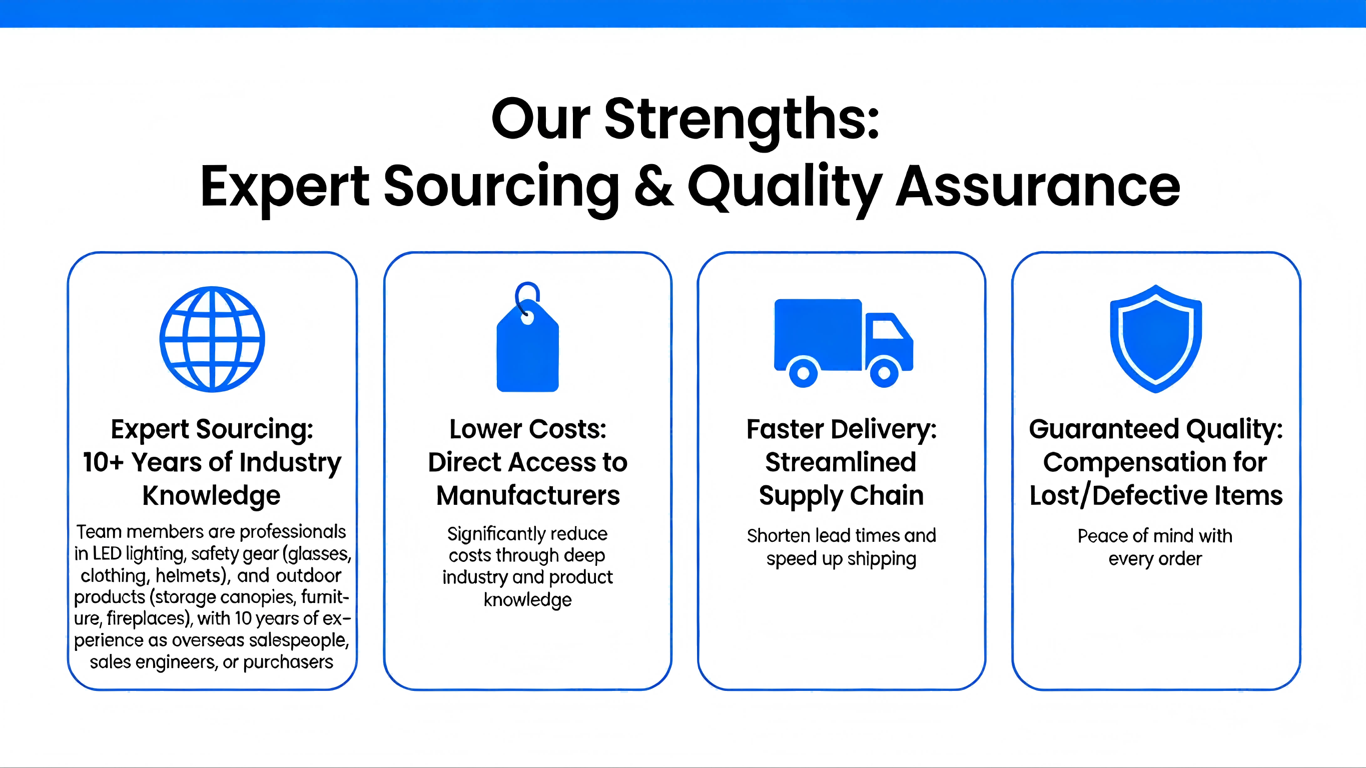 Our strength lies in expert sourcing. Our team members are professionals in industries such as LED lighting, safety gear(glasses,clothing,helmets),and outdoor products(storage canopies,furniture,fireplaces). With 10 years of experience as overseas salespeople,sales engineers, or purchasers, they possess deep industry and product knowledge.